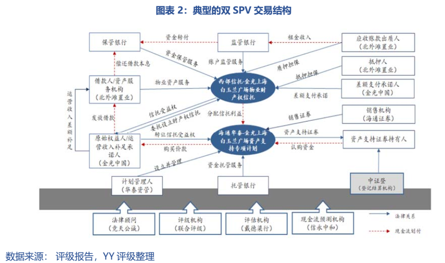 典型的雙SPV交易結構如下圖金光白玉蘭CMBS所示,雙SPV交易結構也是目前我國絕大多數CMBS的交易結構: