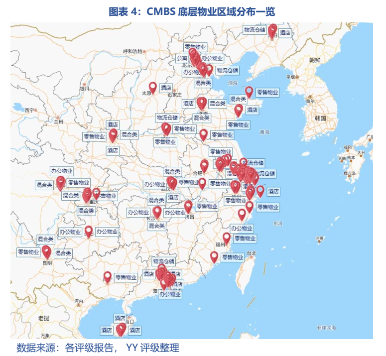 同時,將包含多個資產的CMBS拆開后(共282個物業)為混合類68個、零售物業78個、辦公物業60個、酒店37個以及物流倉儲22個,辦公、零售或辦公購物綜合體的混合類仍為CMBS發行的主力。