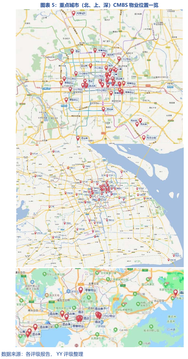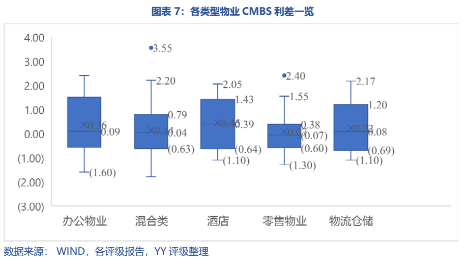 我們以A1優先級的CMBS與主體信用利差為例,不同資產類型和不同城市的利差皆有不同。其中辦公物業、混合類、酒店、零售物業、物流倉儲的平均利差約為36、14、45、7、22 bp;而我們只看重點城市北京、上海、深圳的話(多地為多地多個資產,平均12 bp)平均利差約為22、40、40bp。綜合而言,從利差角度,市場對核心城市(北上深)的辦公物業、酒店、物流倉儲資產認可程度較好,高于總體平均利差,而混合類和零售物業類資產雖然占比很高但方差也較大。