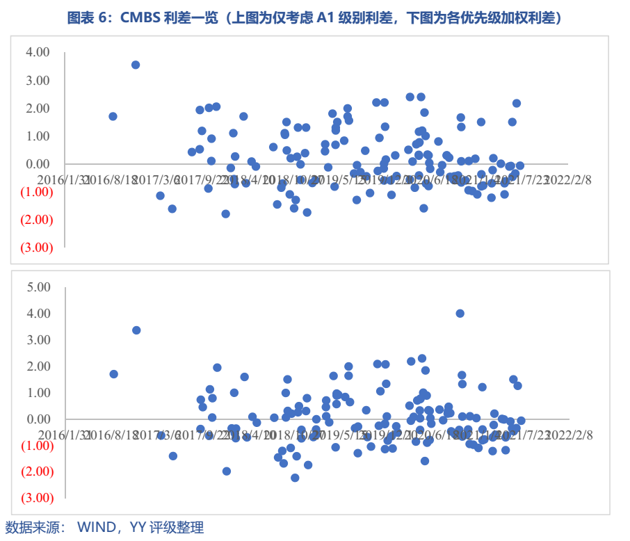 同時,以YY評級計,A1級CMBS對弱主體有較好的增信(較大的利差),但對強主體利差不明顯(也可以理解利率有下限約束)。