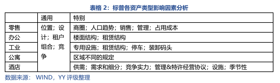 現金流分析是標普CMBS交易評級的起點。通常而言,標普將全球CMBS交易分為五種主要類型:零售、辦公、工業、公寓和酒店,并劃分了幾種資產類型通用的以及不同的對現金流的影響因素,如表2所示。