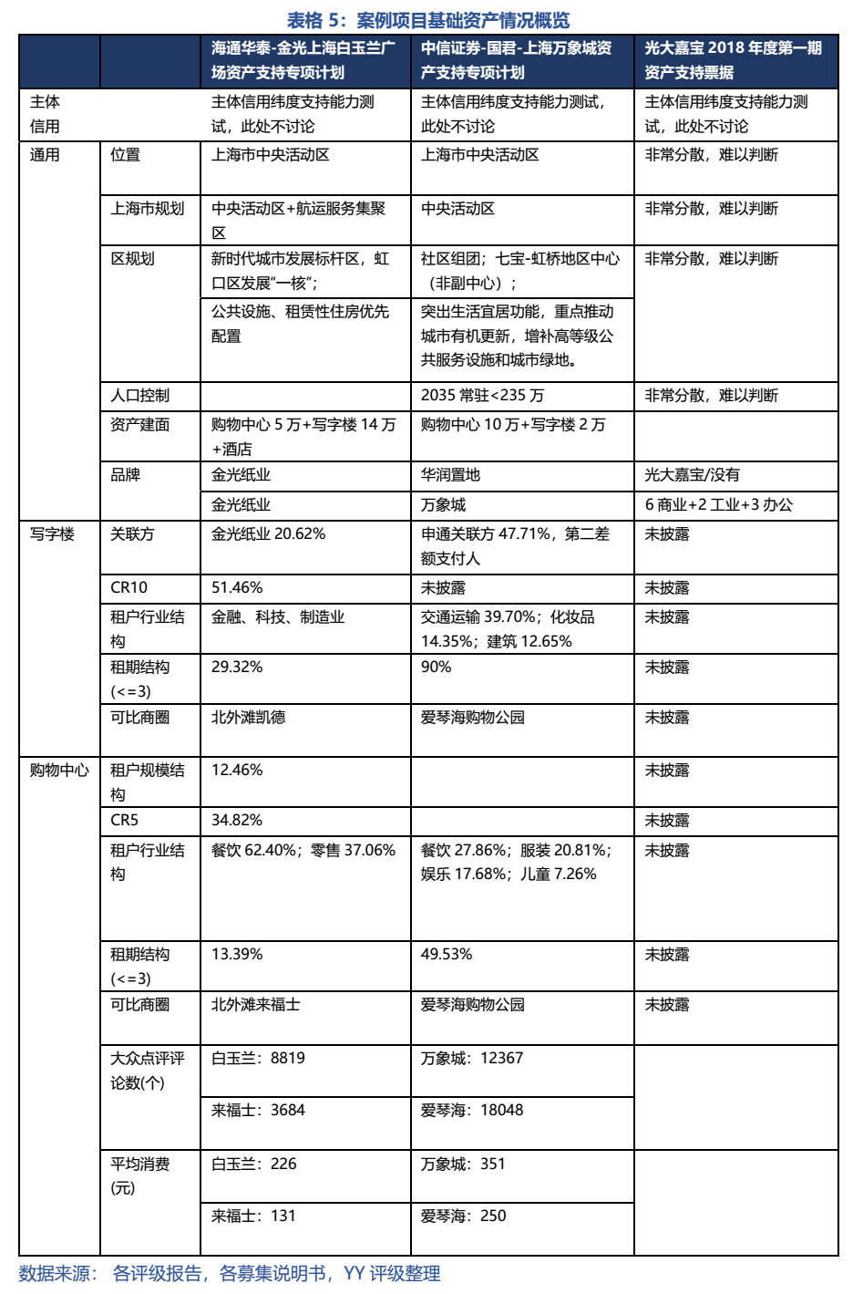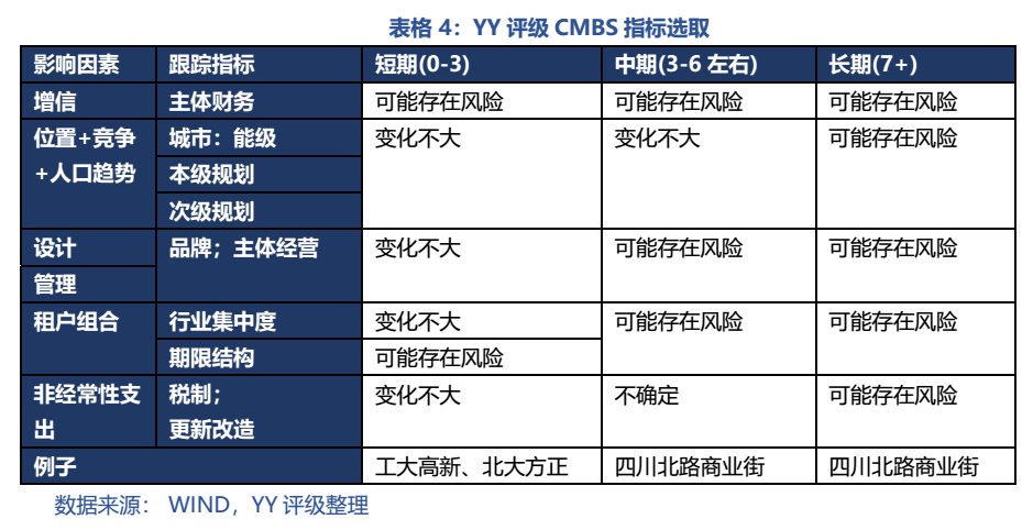 概括而言,表4的指標設計成維度定性跟蹤指標,即主體財務以反映增信風險、主體經營(品牌)以反映設計和管理風險、各級城市規劃也反映位置+競爭+人口趨勢問題以及用行業分布、期限結構來跟蹤租戶組合風險,同時關注一些可能的非經常性支出問題,如稅制改革(房地產稅)和更新改造需求(五角場萬達為10年左右后改造)。