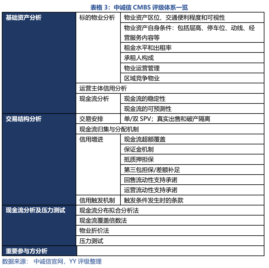 中誠信的商業物業抵押貸款結構化產品評級體系如表3所示,大致分為基礎資產分析、交易結構分析、現金流分析及壓力測試以及重要參與方分析上。