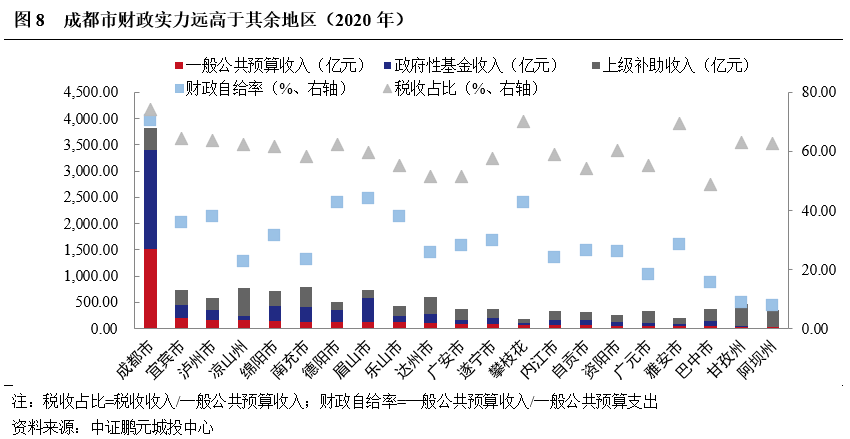 成都市財政實力遠高于其余地區,南充、涼山、眉山、宜賓和綿陽綜合財力處于第二梯隊,川西北生態經濟區財政自給能力最弱。作為全省經濟極核,成都市2020年綜合財力(一般公共預算收入+政府性基金收入+上級補助收入)達3,813.23億元,遠高于其余地市(州);南充、涼山、眉山、宜賓和綿陽綜合財力在700-800億元之間,處于第二梯隊;達州、瀘州、德陽、甘孜州和樂山綜合財力在400-600億元之間,處于第三梯隊;其余地市(州)綜合財力均在400億元以下,其中攀枝花綜合財力最弱,不足200億元。從一般公共預算收入來看,2020年成都市實現一般公共預算收入1,520.38億元,宜賓、瀘州分別居二、三位,一般公共預算收入分別為200.03億元和170.07億元。收入質量方面,僅成都和攀枝花稅收收入占一般公共預算收入的比例超過70%。財政自給率方面,成都市財政自給水平最高,財政自給率達70.40%,其余地區均低于45%;川西北生態經濟區財政自給能力最弱,財政自給率不足10%。