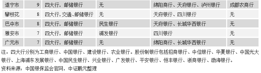 四川省金融資源集中在成都市,其余地區中綿陽、德陽、南充和瀘州金融資源稟賦相對較好,廣元、遂寧、攀枝花等地金融資源相對薄弱