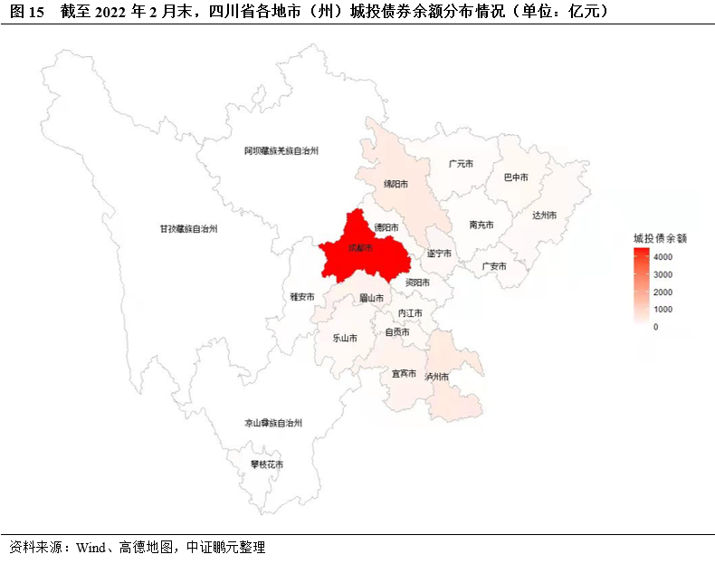 近三年四川省大部分地市(州)城投債融資保持凈流入,成都市凈融資額保持增長,但2021年省級和近一半地市(州)城投債凈融資額同比下降。2019-2021年四川省大部分地市(州)城投債保持凈流入,債券發行與償還量集中在省級和成都市城投平臺,2021年成都市城投債凈融資1,312億元,同比增加202億元;省級城投債凈融資98億元,同比減少102億元;2021年四川省共有10個地市(州)的城投債凈融資額同比下降,其中宜賓和綿陽城投債凈融資下降較多,分別同比下降78億元和133億元。