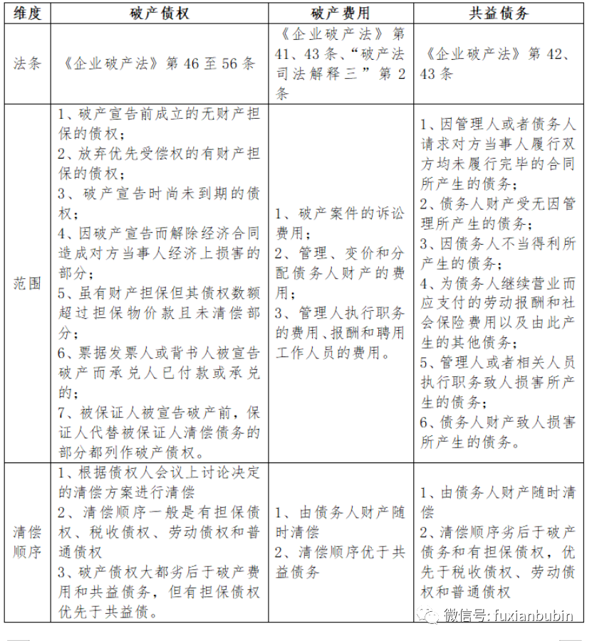 在我國(guó)《企業(yè)破產(chǎn)法》2006年修訂時(shí),將共益?zhèn)鶆?wù)與破產(chǎn)費(fèi)用進(jìn)行分離,考慮到二者均是為債權(quán)人的共同利益而負(fù)擔(dān)且均由債務(wù)人財(cái)產(chǎn)隨時(shí)清償,清償順序均優(yōu)先于大部分破產(chǎn)債權(quán)。為更好的厘清共益?zhèn)秶瑢?duì)破產(chǎn)費(fèi)用、破產(chǎn)債權(quán)和共益?zhèn)M(jìn)行對(duì)比分析如下: