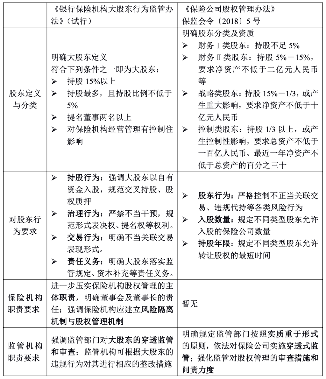 目前,對保險(xiǎn)公司股權(quán)管理及股東行為起約束作用的監(jiān)管規(guī)定主要是《大股東監(jiān)管辦法》和《股權(quán)管理辦法》。對比來看,《股權(quán)管理辦法》對保險(xiǎn)公司股東準(zhǔn)入、股權(quán)管理、關(guān)聯(lián)交易等作出相應(yīng)的監(jiān)管規(guī)定;《大股東監(jiān)管辦法》則重點(diǎn)從大股東角度出發(fā),明確其責(zé)任義務(wù),規(guī)范其股東行為,加強(qiáng)事中事后監(jiān)管,是對現(xiàn)有股權(quán)監(jiān)管制度的細(xì)化補(bǔ)充和完善統(tǒng)一。兩個(gè)制度的對比分析具體如下:
