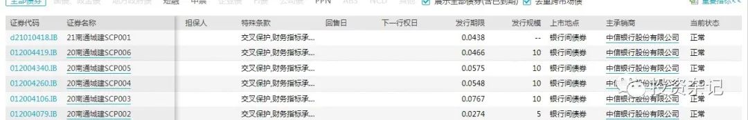 你看看發行期限這一欄,最短的是0.0274年,這到底是多長時間呢?0.0274*365=10天,最長的20南通城建SCP003是0.0767年,這個是多長呢,0.0767*365=27.99天,也就是28天。你看看,在這個案例中,發債業務搞成了最短七天、最長28天的資金品種,雖然SCP只要期限不超過270天就可以,并沒有禁止這種超短期限,但是發這么短的債圖個啥?對于投行來講,我覺得就是想做大流量,沖沖規模,年底啊之類的時點在沖下規模排名。對于企業來講,短貸長用,降低資金成本,但是老是這么搞,萬一規模搞大了,就怕哪天續不上就尷尬了。