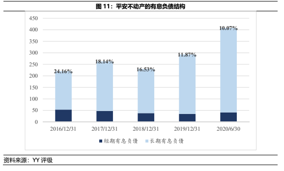 由于平安不動產的管理規模擴增是基于平安集團的LP資金(體現于長期股權投資方面的表外)注入,而表內的結構穩定則是基于主動投資收益尚能覆蓋財務費用,疊加被動收入和股東背景支持。因此圖11可見,隨著有息負債杠桿的增加,平安不動產仍能維持相當低比例的短期有息債務。