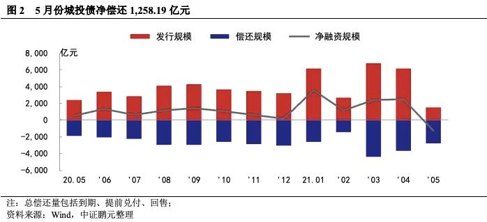 5月份城投債總到期規模2,770.71億元,融資表現由以前月度的凈融資轉為凈償還1,258.19億元,是自2019年來首次出現凈償還。綜合1-5月份情況來看,城投債累計凈融資規模8,434.87億元,同比減少18%,發行規模下降是導致城投債凈償還的主要因素。5月份,無推遲或取消發行的城投債。