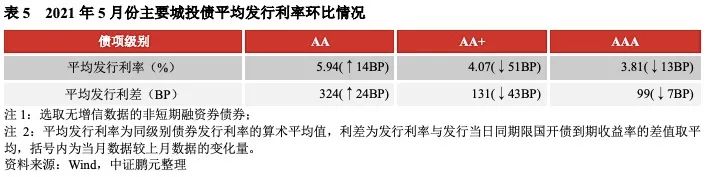 2021年5月份城投債發行人AA+級別以上級別合計占比達到61.8%。具體看,AAA主體發債51只,占比25%,比上月下降0.5個百分點;AA+主體發債75只,占比37%,比上月下降1.0個百分點;AA主體發債77只,占比38%,比上月上升1.9個百分點。整體看,城投債主體信用級別中樞下移。綜合1-5月份情況來看,發行主體在AA+級(含)以上等級的城投債合計占比65%,較1-4月份中樞下移,但與2020年主體級別中樞基本持平。