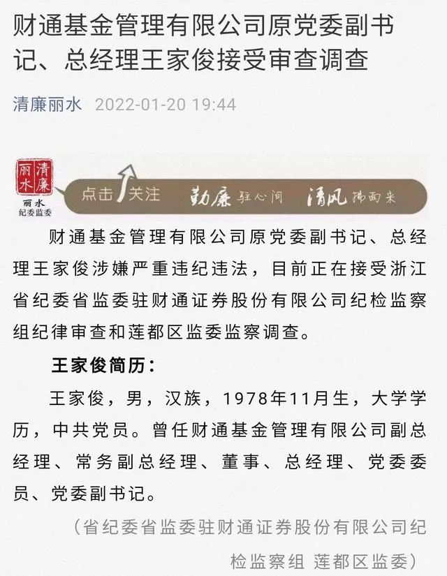 1月20日,財(cái)通基金原黨委副書(shū)記、總經(jīng)理王家俊涉嫌嚴(yán)重違紀(jì)違法,目前正在接受紀(jì)律審查和監(jiān)察調(diào)查;