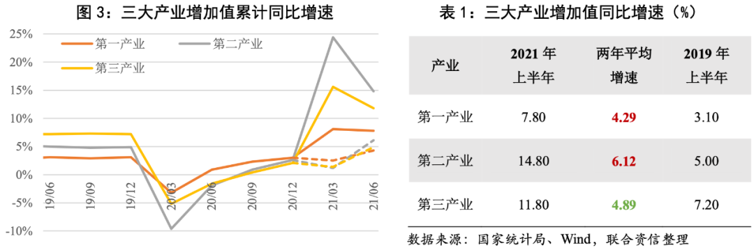 2021年上半年,我國經濟穩定修復,結構有所改善但仍未實現根本性的好轉,消費拉動弱于疫情前水平是GDP增速的主要制約。上半年工業生產較快增長,工業增加值兩年平均增速[1]高于近幾年同期水平,由于碳達峰工作的推進以及環保限產措施的實施,鋼鐵、有色和水泥等部分行業產能擴張空間有限。服務業與疫情前水平仍有一定差距,主要受局部性疫情影響,住宿和餐飲、租賃和商務服務業拖累明顯。