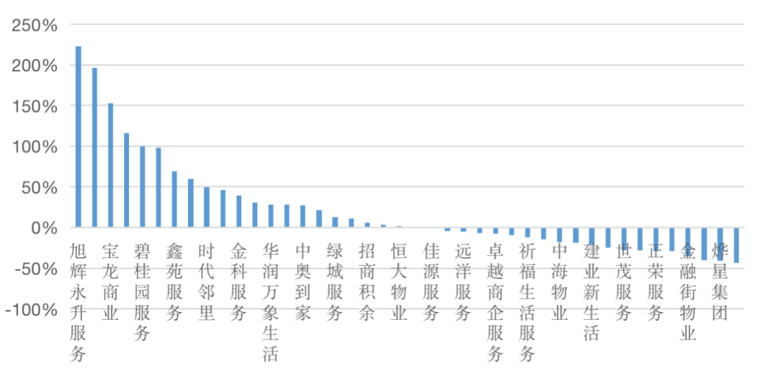 經歷了2020年的上市潮,物管行業在資本市場的整體表現正在趨于理性。2019年24家上市物企全年股價漲幅均值為58.02%,到了2020年,上市物企數量達到42家,整體股價漲幅均值卻降為21.55%,其中僅有15家股價漲幅超過均值,超6成物業股股價漲幅低于板塊均值。