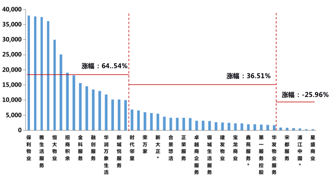 圖:2020年物企在管規模及各梯隊股價平均漲幅