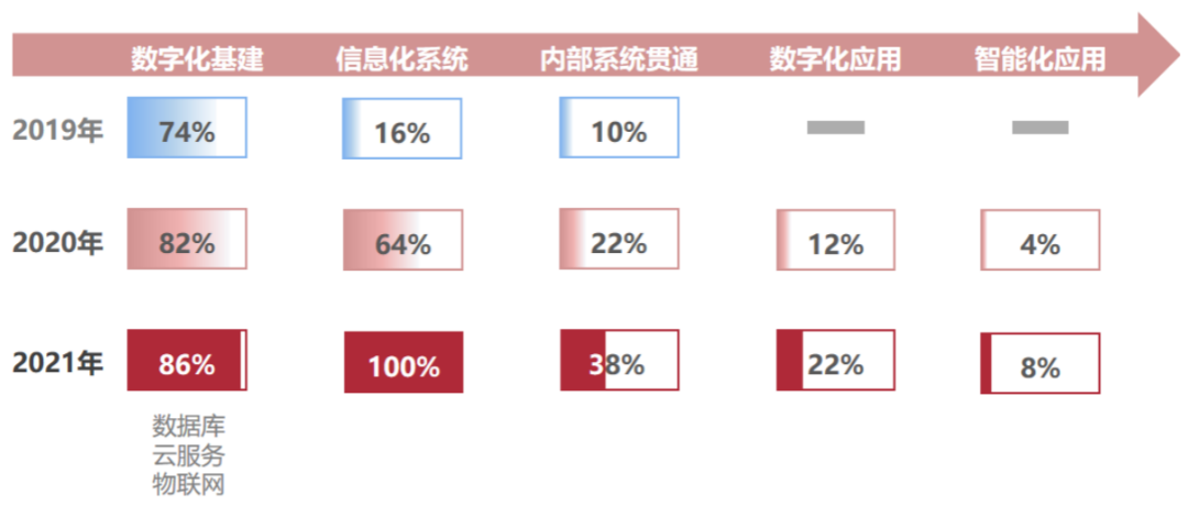 但是,房企在數(shù)字化轉型許多細分領域的建設則有待加強。截止2021年,僅有38% 的TOP50房企基本實現(xiàn)了內(nèi)部數(shù)據(jù)系統(tǒng)的互通,雖然相較 2019 年的 10% 進步明顯,但是整體建設水平依然滯后。TOP 50 房企在數(shù)字化應用方面的拓展情況則更為堪憂,僅有 22% 的頭部房企真正步入了數(shù)字化應用的階段,部分實現(xiàn)了常見數(shù)字化應用的落地,并取得了一些成效。