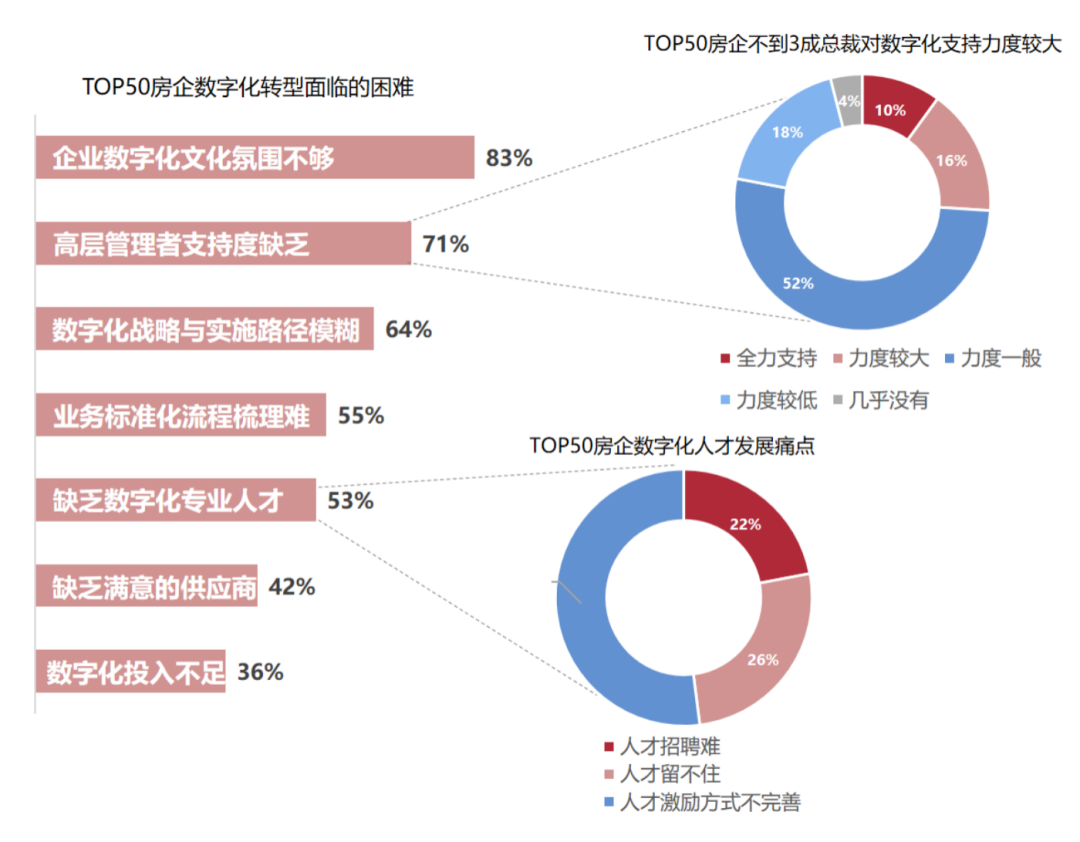 “企業(yè)數(shù)字化文化氛圍不夠”、“高層管理者支持度缺乏”是TOP50房企數(shù)字化轉型目前面臨的首要難題。