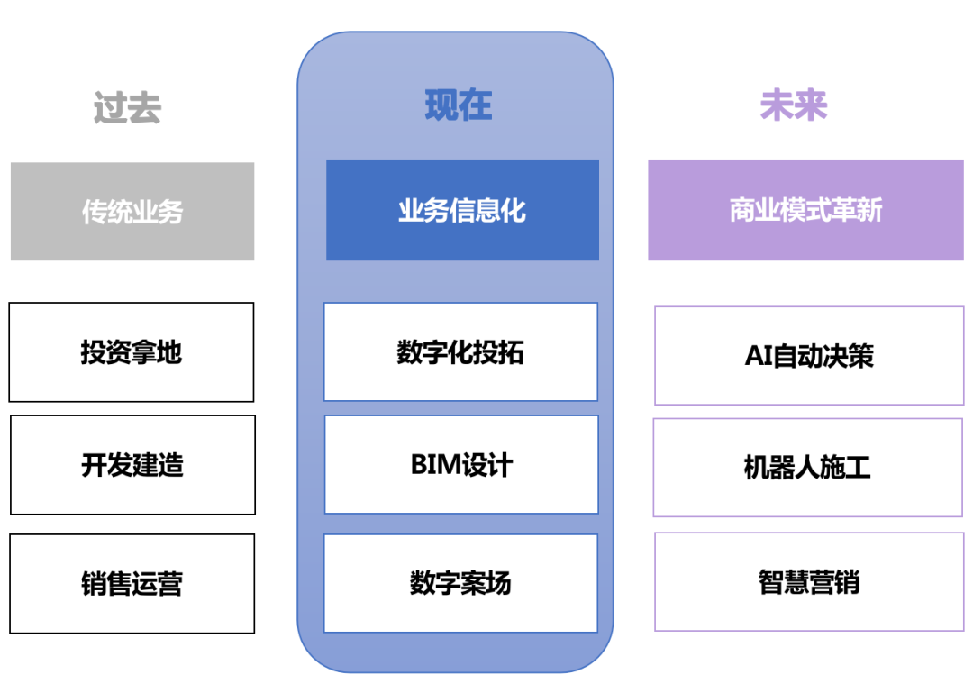 當前頭部房企數(shù)字化轉型剛邁過信息化建設階段,正處在數(shù)字化轉型的初期。過往頭部房企的管理與運營資源大多聚焦于傳統(tǒng)業(yè)務的拓展方面,現(xiàn)階段房企發(fā)展的著力點將是通過數(shù)字化轉型賦能,實現(xiàn)傳統(tǒng)業(yè)務的提質增效與新業(yè)務機會的拓展與深化。