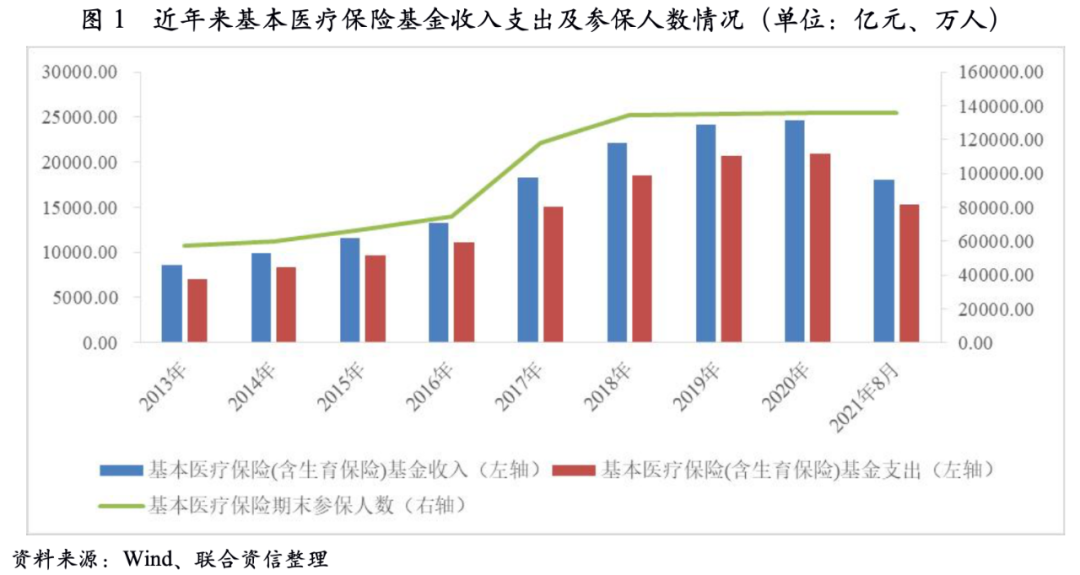 從醫藥行業下游支付能力來看,醫?;鹱鳛樽钪匾闹Ц斗?,其支付額約占整體醫療衛生總費用的約40%,醫?;鸬闹Ц赌芰χ苯記Q定了醫藥行業的回款情況。根據國家醫保局數據顯示,2020年,全國基本醫?;穑êkU)總收入為2.46萬億元,同比增長0.08%;全國基本醫保基金(含生育保險)總支出為2.09萬億元,同比變化不大,年末醫?;鹄塾嫿Y余3.14萬億元。2021年1-10月,全國基本醫保基金(含生育保險)總收入為2.46萬億元,全國基本醫?;穑êkU)總支出為1.90萬億元。
