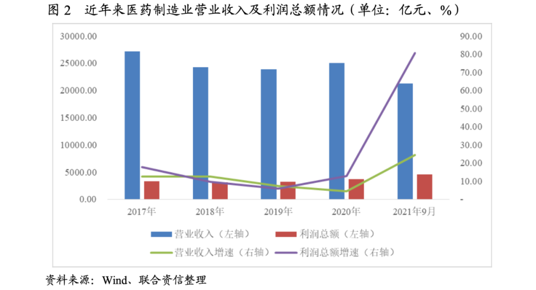 2020年,受新冠肺炎疫情影響,各層級醫療機構日常診療活動減少,藥品終端銷售市場規模近年來首次出現負增長,但隨著人均可支配收入增長、人口老齡化趨勢逐年加重以及醫保收入和參保人數增加,中國醫藥需求仍保持穩健。2021年以來,醫藥行業盈利水平逐漸從新冠肺炎疫情的影響中恢復,醫藥制造業企業營業收入和利潤總額均大幅增長;同時持續加強創新研發投入,行業內企業獲現能力持續提升,杠桿水平處于合理水平。