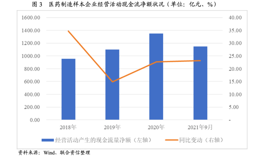 獲現能力方面,2021年1-9月,醫藥制造樣本企業經營活動產生的現金流量凈額為1149.54億元,較上年同期增長23.20%,延續了2018年以來現金流持續優化的行業發展趨勢。