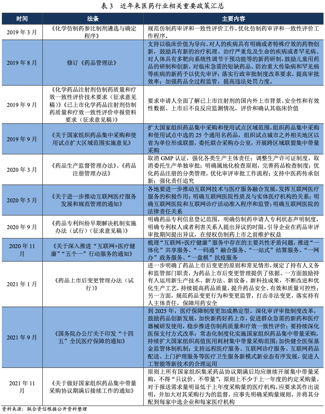2019年以來,集中帶量采購、醫保控費等政策的持續推進為醫藥行業帶來了深刻變革;與此同時,藥品審評審批、專利糾紛早期解決等政策的不斷完善也為醫藥行業帶來了新的機遇。2020年新冠疫情催生“互聯網+醫療”的蓬勃發展,相關規范化政策的陸續出臺為“互聯網+醫療”的可持續發展保駕護航。2021年“十四五”規劃發布,進一步明確醫藥行業發展方向,各項政策持續推進。