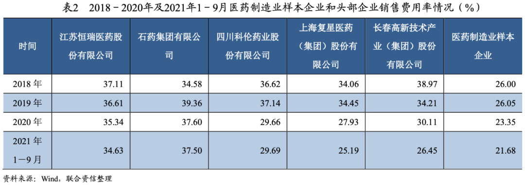從醫藥制造業樣本數據分析[2]來看,2018-2020年,醫藥制造樣本企業銷售費用率分別為26.00%、26.05%和23.35%,波動下降,但處于較高水平。2021年1-9月,醫藥制造樣本企業銷售費用率為21.68%,較上年同期下降1.40個百分點。2018-2020年,頭部企業銷售費用率均大于27.00%,處于較高水平,對利潤水平存在一定影響。