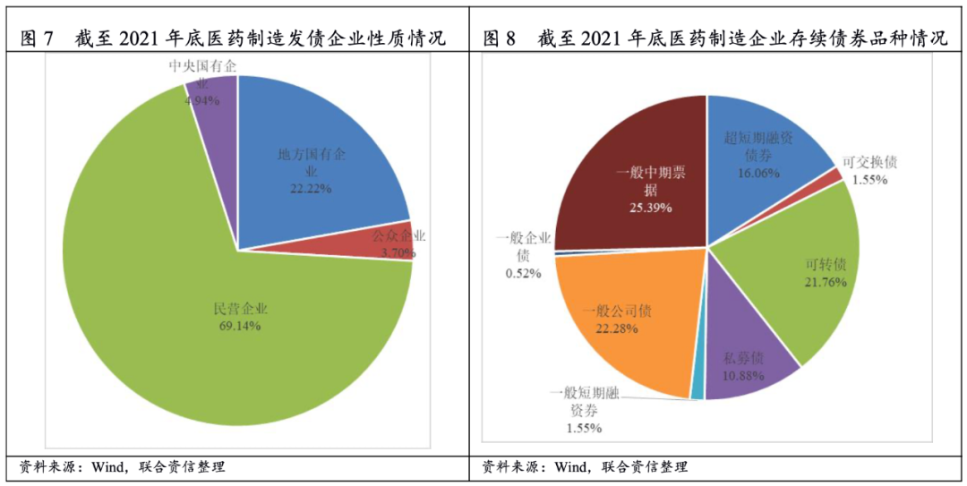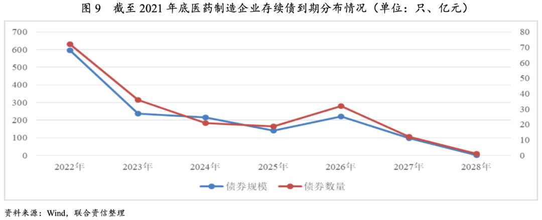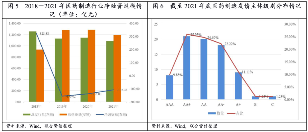 行業債務負擔加重,2021年醫藥制造行業債券到期規模較大,凈融資規模呈凈流出狀態。行業內發債企業主要集中于AA+級別民營企業。