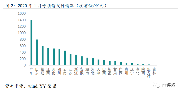 從發行地區來看,1月份發行專項債較多的省份有廣東省(占比19.5%)、山東省(占比11.1%)、福建省(占比8.2%)、江西省(占比7.4%)、河南省(占比7.3%)。從發行主體來看,除了深圳市、青島市、廈門市為地級市政府,其他發債主體都是省級人民政府或直轄市人民政府。