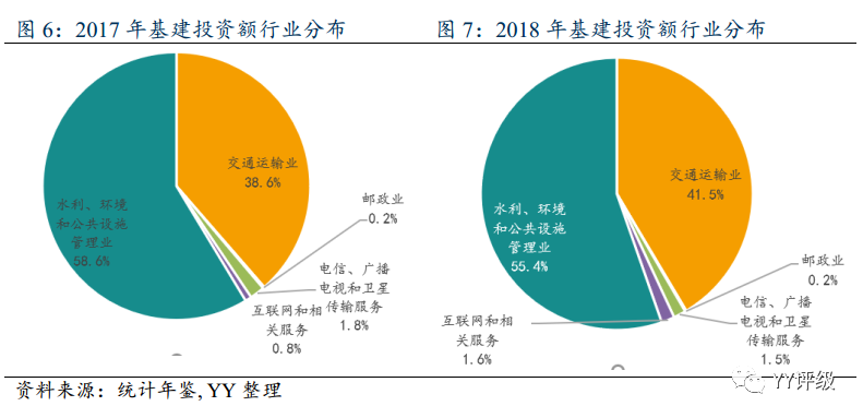 從投資行業來看,近幾年投資占比最高的還不是說起基建首先想起的交通運輸業,而是水利、環境和公共設施管理業。2018年水利、環境和公共設施管理業占比55.4%,不過相比2017年有所降低。交通運輸業投資占比41.5%,相比上年有所提高。郵政業、電信廣播電視和衛星傳輸服務業、互聯網和相關服務占比很小,其中互聯網和相關服務占比在2018年增加了1倍。