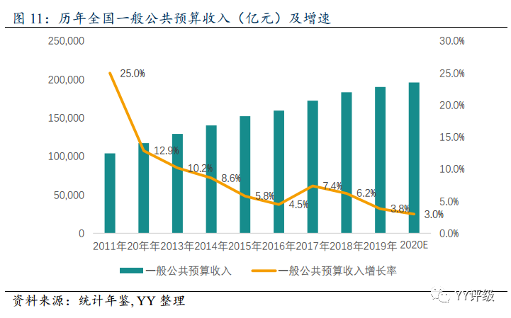 預算內資金主要是來源于一般公共預算。從總體趨勢來看,一般公共預算收入維持連年增長,但是增速基本逐年下跌。2019年全國實現一般公共預算收入190382億元,同比增長3.8%。考慮到2020年經濟下行壓力較大、為應對疫情可能進一步降稅,預計一般公共預算收入增速將進一步降低至3.0%左右,一般公共預算收入為19.6萬億元左右。