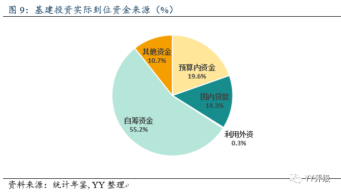 資金能否到位是基建項目能否落地的主要制約因素,基建投資的資金來源分為預算內資金、國內貸款、自籌資金、利用外資和其他資金。