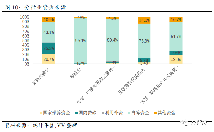 分行業來看,相對來說,交通運輸業中自籌資金占比低于平均水平,國內貸款占比高于平均水平。郵政業以及電信、廣播電視和衛星傳輸服務業資金來源基本由自籌資金構成,水利、環境和公共設施管理業以及互聯網和相關服務業中自籌資金占比也很高。不過由于交通運輸業以及水利、環境和公共設施管理業的投資合計占基建投資的95%以上,資金來源結構基本是由這兩個行業決定的。