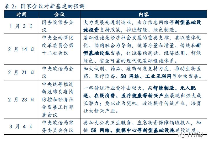 我們不僅僅應當關注基建的總規模,更應當關注基建的結構,基建的總規模在短期內能發揮較大的作用,而基建的結構才是決定長期的投入產出效率的關鍵。近期以來,“新基建”一詞在國家層面文件中頻繁出現,已經成為2020年熱詞,一連串會議極大地強調了新基建的重要性。