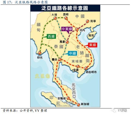 此次云南基建中的重大項目大瑞鐵路、沿邊鐵路、玉磨鐵路、沿邊高速、跨境電網和智能電網基本都直抵中盟腹地的。玉磨鐵路、大瑞鐵路分別為泛亞鐵路中線、細線的重要組成部分,沿邊鐵路則連接了泛亞鐵路東、中、西線,泛亞鐵路是2010年由亞洲18個國家正式簽署的《亞洲鐵路網政府間協定》正式確立下來的,是一座連接亞、非、毆三大洲的最大的“橋梁”和通道。