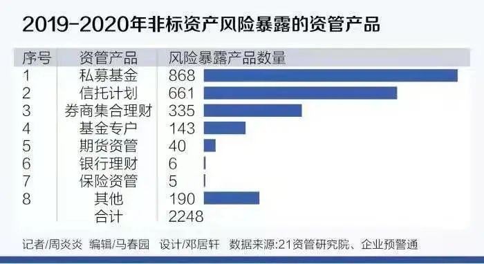 從21世紀(jì)資管研究院的數(shù)據(jù)顯示,2019-2020期間一共發(fā)生過的非標(biāo)違約債項(xiàng),僅從公開數(shù)據(jù)統(tǒng)計(jì)顯示就有超2200條之多。涉及信托計(jì)劃、券商集合、私募基金、期貨資管、銀行非保本理財(cái)和保險(xiǎn)資管,波及的資管機(jī)構(gòu)高達(dá)上百家。