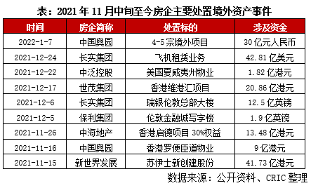 值得注意的是,部分房企短期內多次處置境外資產。例如,中國奧園在2022年1月處置境外資產之前,于上年11月以9億港元出售香港羅便臣道若干物業;長實集團于2021年12月先后以12.5億英鎊出售了瑞銀倫敦總部大樓,以42.81億美元出售了飛機租賃業務。