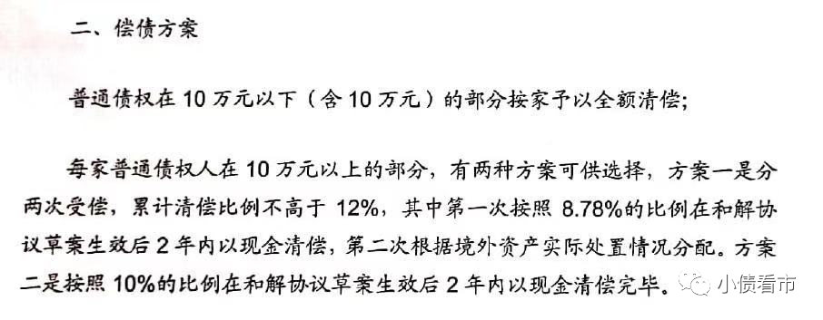 分兩次受償,累計清償比例不高于12%,其中第一次按8.78%比例在和解協(xié)議草案生效后兩年內(nèi)現(xiàn)金清償,第二次根據(jù)境外資產(chǎn)實際處置情況分配。