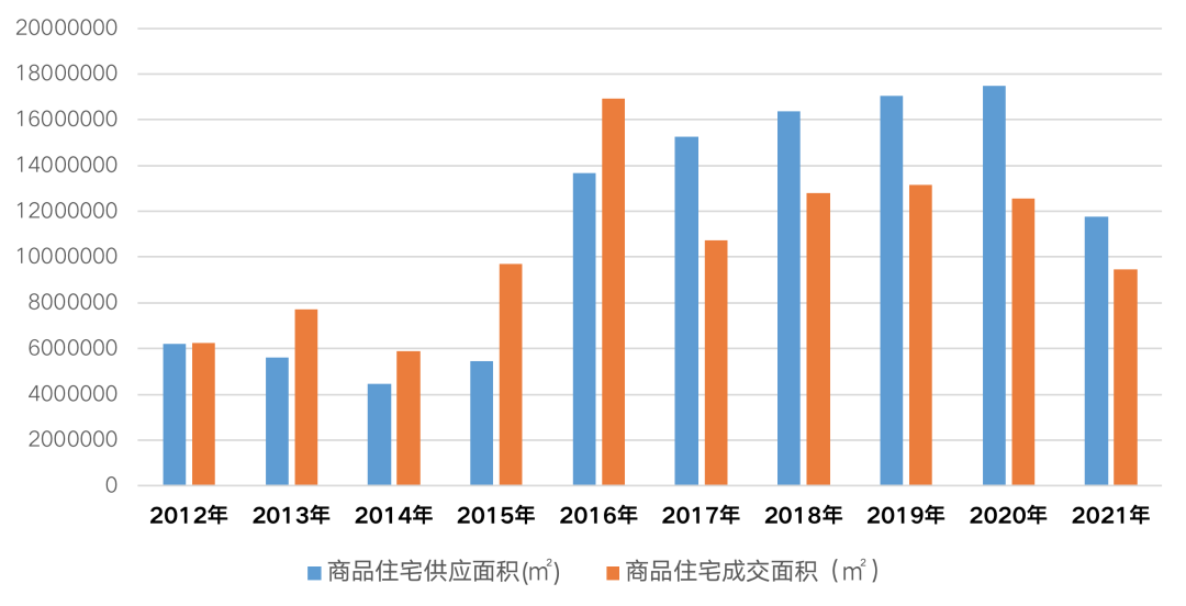 首先,鄭州樓市常年處于供大于求的狀態。從供求關系來看,2016年可以說是鄭州樓市的分水嶺。在此之前,需求持續釋放,此后成交規模大幅上升后,鄭州樓市便開始了漫長的回調。商品住宅成交規模逐年走低,降價促銷、低首付等以價換量的策略層出不窮。2021年商品住宅成交面積僅為948萬平方米,較2020年下降24.45%。