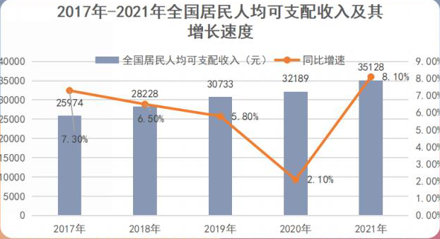雖從2020年起,中國經濟就被疫情籠罩,但在2021年人均GDP仍突破8萬億元,人均可支配收入也自2019年實現三連漲,不過值得注意的是人均消費支出卻出現了負增長。一方面在于,疫情的沖擊導致了電影院、KTV、餐飲等人流密集的行業關停,進而極大地降低了消費者線下消費的意愿;另一方面,人均可支配收入增速的放緩也在一定程度上影響了人們的消費預期。