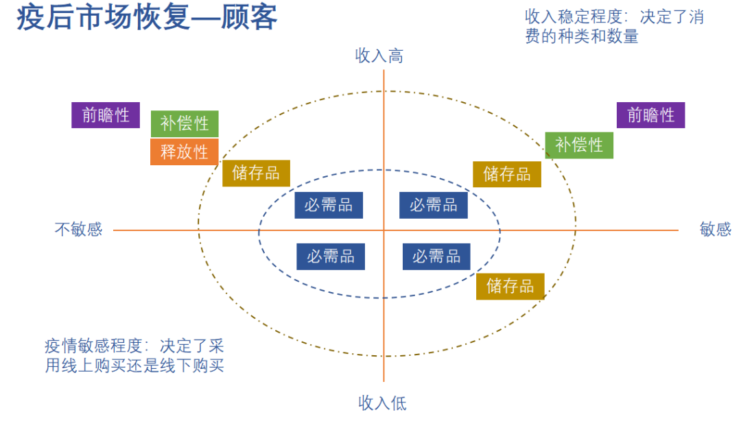 從顧客收入和疫情影響兩個維度可以把顧客需求分為四個象限,消費者的收入穩定程度決定了其消費的種類和數量,種類主要分為必需品、儲存品、釋放性、補償性、前瞻性;疫情敏感程度決定了采用線上購買還是線下購買。