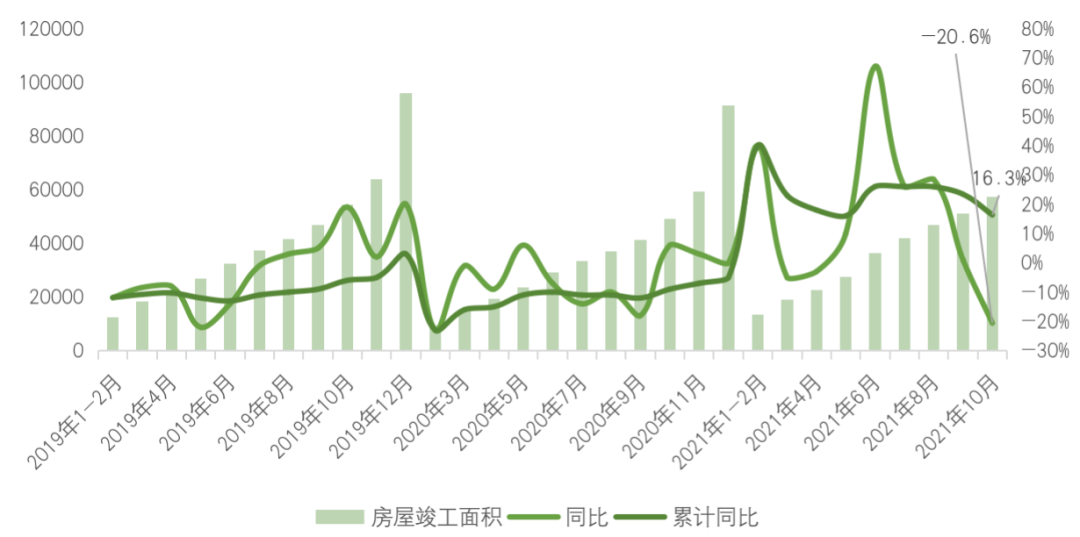 10月全國房屋竣工面積6277萬平方米,同比下降20.6%,由正轉負降幅擴大21.6pct。1-10月全國房企本年到位資金同比增速降至8.8%,受房企資金流動性緊張影響,全社會以建筑業為代表對房地產業后市預期悲觀,擔心后續工程款項兌付問題下部分工期收尾項目已出現停工現象,受此影響下全國整體竣工強度與規模均由三季度高點快速下降。