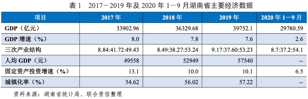 湖南省整體經濟實力較強,經濟總量及人均GDP處于全國中等偏上水平,經濟發展態勢良好。2020年前三季度,受新冠肺炎疫情影響,湖南省經濟增速明顯下滑,新冠肺炎疫情對湖南省經濟和社會發展造成一定影響。2019年湖南省一般公共預算收入規模位列全國第十三,一般公共預算收入穩定性較強,財政自給能力偏弱,整體財政實力一般。2019年,湖南省負債率為25.60%,債務負擔較重;湖南省債務率為104.95%,償債能力一般。