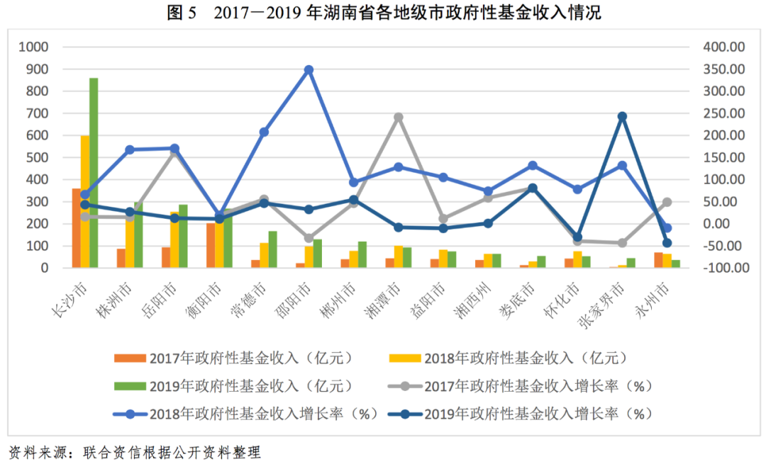 政府性基金收入方面,長沙市的政府性基金收入規模位于全省首位,達到859.21億元,占湖南省政府性基金收入的比例為28.70%;株洲市、岳陽市、衡陽市、常德市、邵陽市及郴州市政府性基金收入規模在100~300億元區間,其他地州市政府性基金收入規模較小,不足100億元。2019年,除湘潭市、益陽市、懷化市和永州市政府性基金收入呈現下降態勢外,其他地州市政府性基金收入均有所增長,其中張家界市及婁底市增速很高,超過80%。
