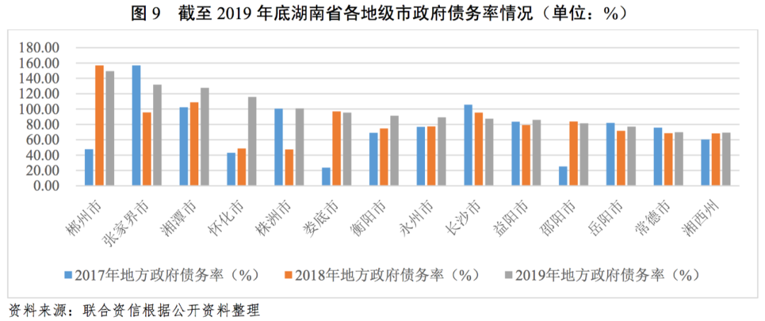 湖南省各地級市的債務規模差異較大,張家界市、株洲市、湘潭市和郴州市“發債城投企業全部債務+地方政府債務”/GDP的比值較高,湘潭市、張家界市、株洲市、郴州市、長沙市和常德市地方政府財政收入對“發債城投企業全部債務+地方政府債務”覆蓋程度相對較低。