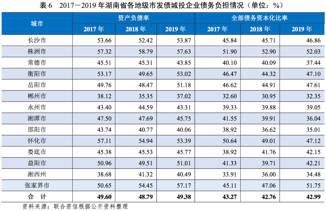 從各地區債務負擔來看,“發債城投企業全部債務+地方政府債務”/GDP較高的地級市分別為張家界市、株洲市、湘潭市和郴州市,截至2019年底,上述地區該比值均超過60%,債務負擔較重;益陽市、永州市和婁底市比值不超過40%,債務負擔相對較輕。