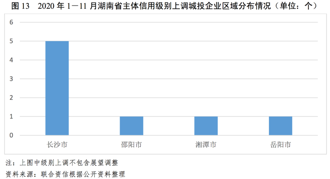 從級別遷徙來看,2020年1-11月,湖南省城投企業主體信用級別變動全部為上調,主體信用級別上調城投企業合計8家,其中長沙市數量最多為5家;湖南省城投企業主體信用級別無下調現象。