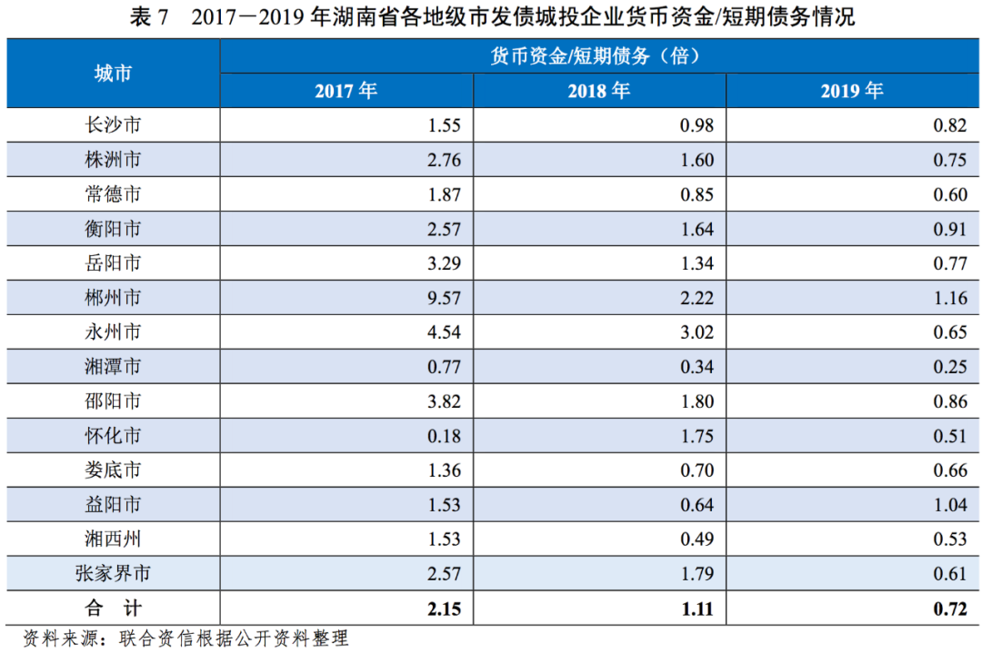 2019年,湖南省發債城投企業債務負擔有所加重。各地級市發債城投企業債務償還仍主要依賴于外部籌資,且受債務集中到期影響,湖南省各地級市的發債城投企業短期償債能力指標有所弱化,償債壓力持續加大;長沙市、株洲市和常德市的城投企業未來三年集中到期債券規模大,2021年城投企業到期債券集中償付壓力較大的地級市為株洲市、郴州市、湘潭市和常德市,需關注面臨集中償付壓力和地方政府債務負擔較重的地級市區域內城投企業的再融資情況。