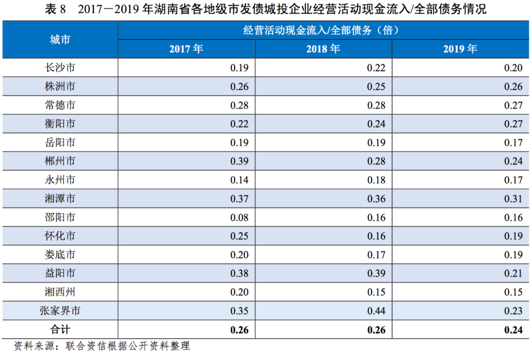 從湖南省各地級市發債城投企業經營活動現金流入對全部債務的覆蓋情況來看,湖南省各地級市發債城投企業經營活動現金流入對全部債務覆蓋程度均相對較低,2019年覆蓋程度仍維持在較低水平,債務償還對外部籌資依賴較大。